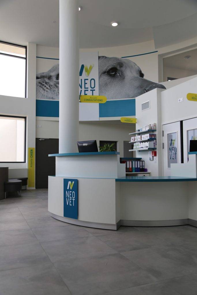 Agencement des nouveaux bâtiments de la clinique Néovet à Perpignan : son espace d’exposition, son espace d’accueil, son espace pharmacie et son espace attente. L’ensemble du projet est construit sur mesure ainsi que la signalétique. L’esprit verrière ronde du bâtiment pour créer un banc d’attente en forme, des présentoirs transparents et une banque d’accueil avec adaptation PMR. Les couleurs bleu et vert anis de la signalétique apporte une touche de couleur lumineuse. Elle a été travaillée en collaboration avec notre partenaire Arborescence & Co.