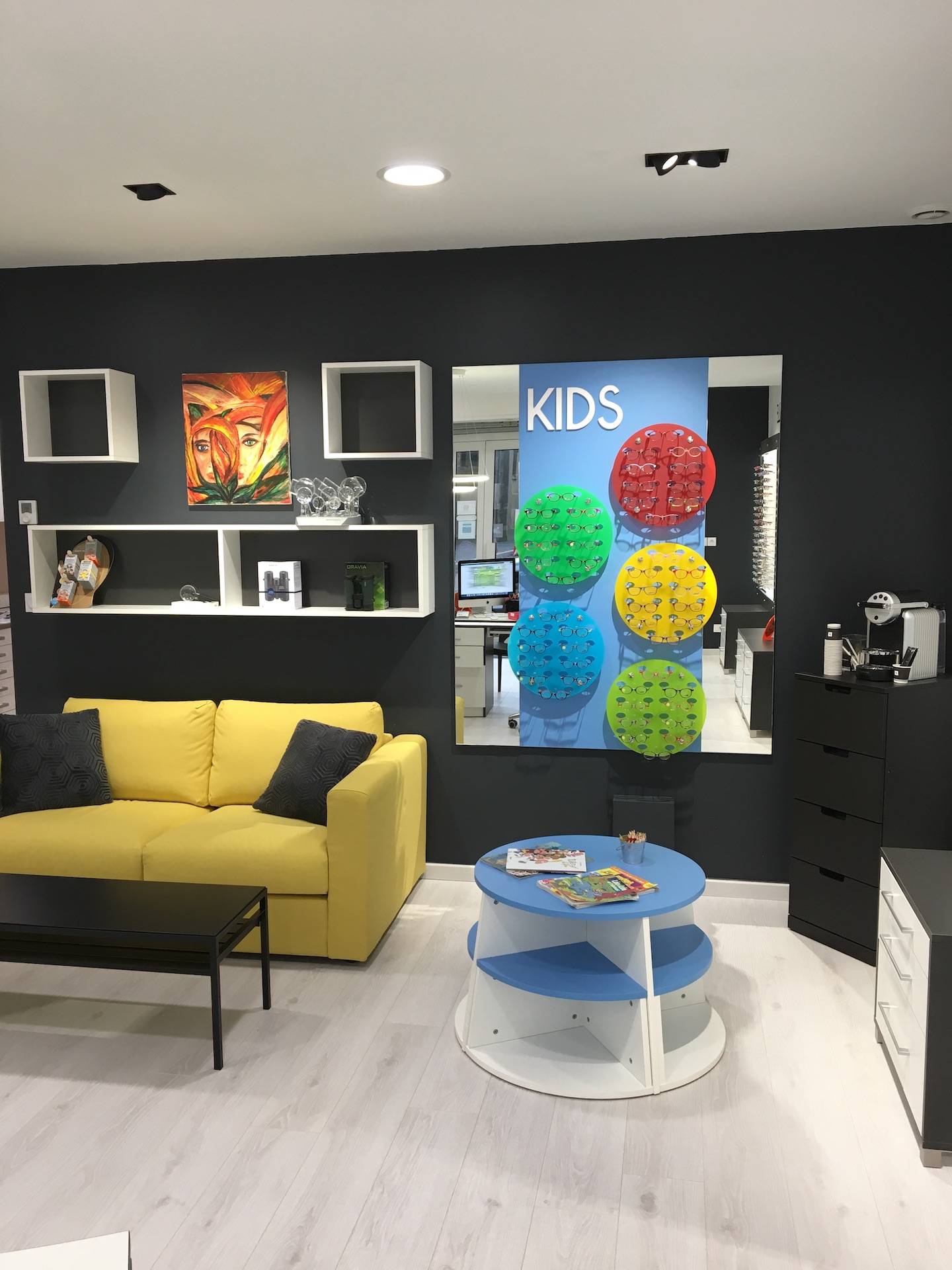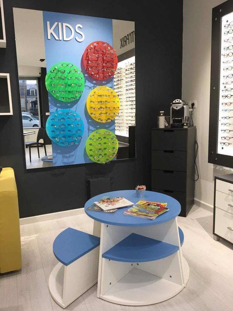 • Les cadres rétroéclairés valorisent les montures tout en les segmentant par type et les meubles bas optimisent le stock à disposition. Des présentoirs colorés et ludiques animent l’espace enfant.